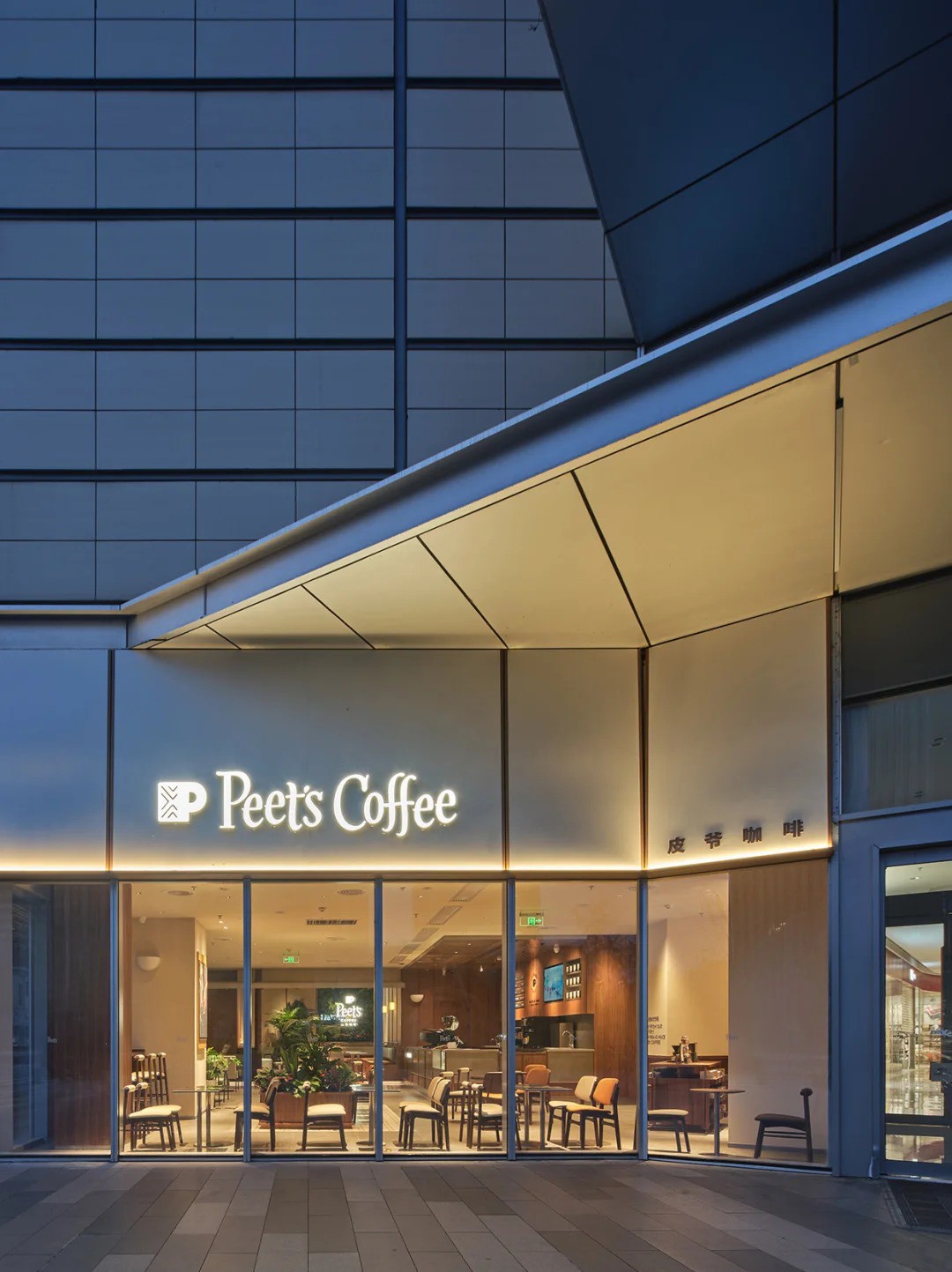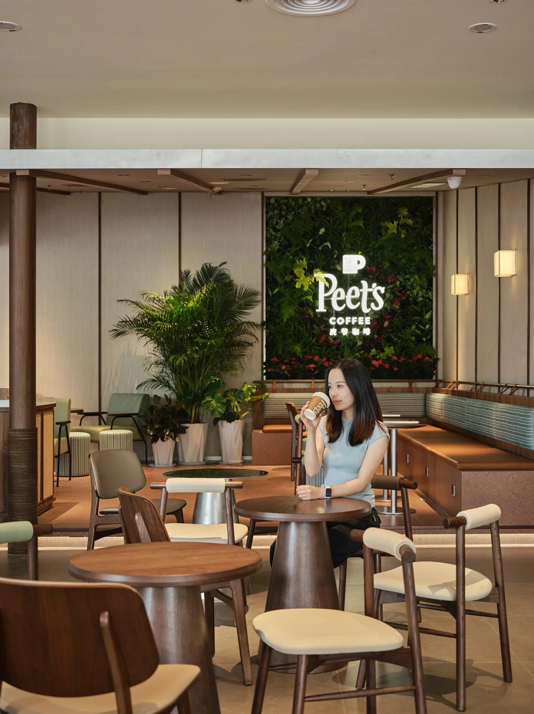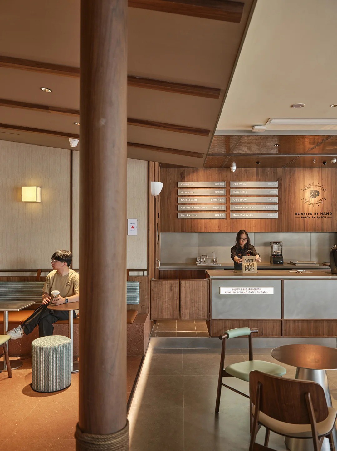 色彩搭配以低饱和暖色调为主基调,深棕与米白的组合,既匹配泰州水乡晨雾、古桥与园林的自然景致,又贴合皮爷现代复古的品牌审美。为打破色调单一感,设计巧妙植入绿植造景,零星绿植既是城市喧嚣中的 “诗意点缀”,象征水乡生机,更暗合品牌对咖啡原材自然属性的重视,强化空间 “在地性” 与品牌的情感联结。