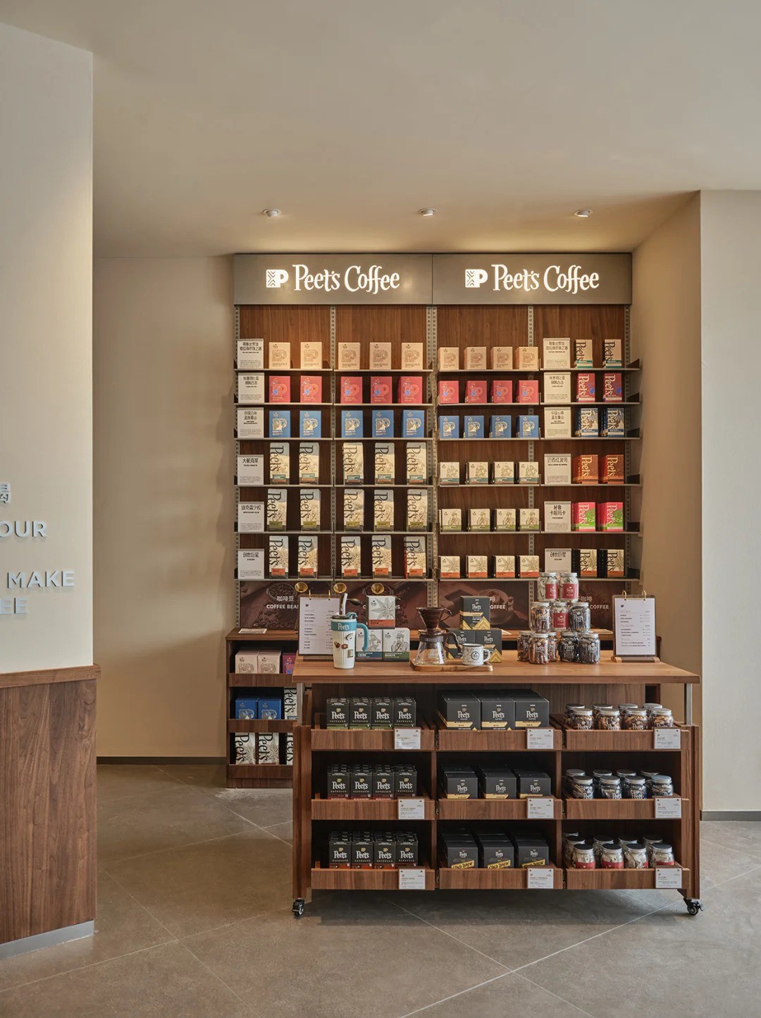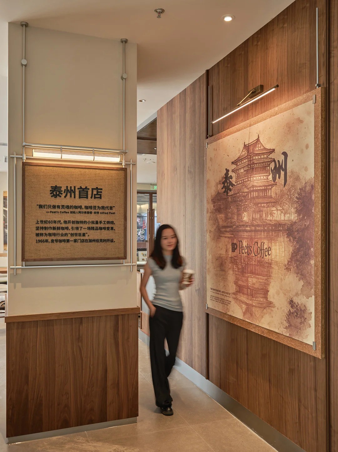 此外,空间融入带泰州元素的装饰画、文创周边等细节。这些设计让 “在地化咖啡体验” 从抽象概念变为可触可感的空间语言,使泰州皮爷首店超越 “咖啡消费场所” 的单一属性,成为联结品牌与城市文化、传递在地生活美学的独特载体。