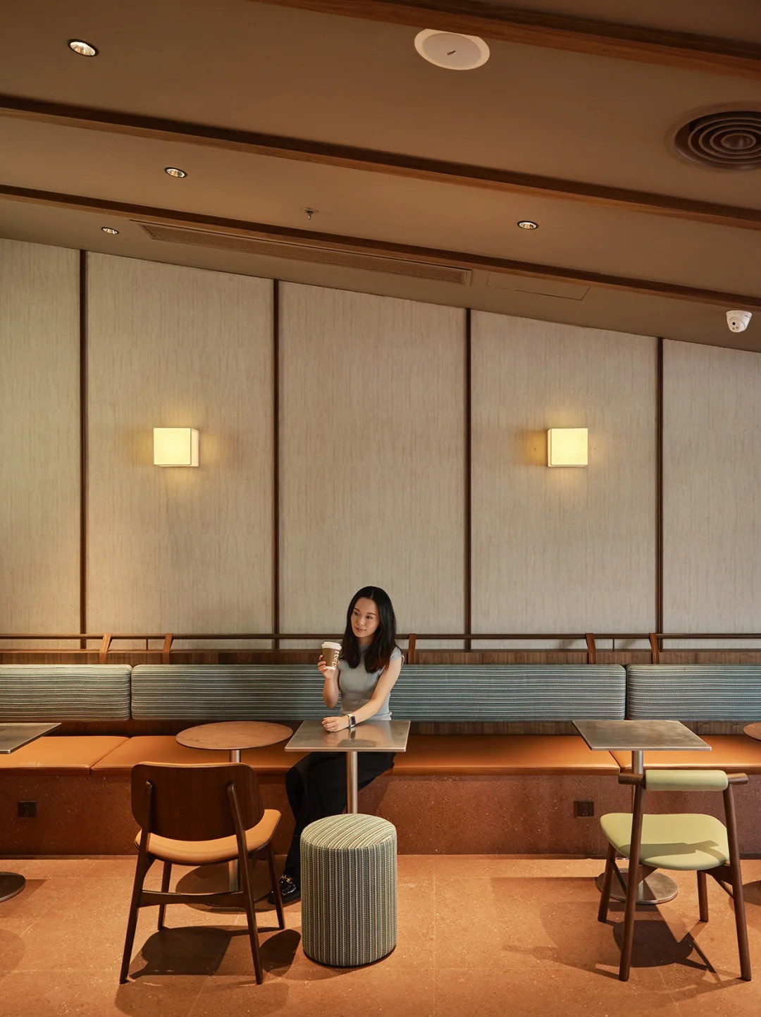 核心元素重构上,设计以现代手法创新演绎泰州古建元素。不同于传统古建的繁复细节,设计师对古建元素进行简化提炼,用流畅线条勾勒美学轮廓,以几何造型重构结构韵律,搭配金属、玻璃等现代材料,让传统元素褪去厚重历史感,焕发现代简约气质。顾客进店后,视线会被这些兼具地域特色与现代感的元素吸引,雅致氛围让人仿佛穿梭泰州古巷园林,在都市咖啡空间直观体验地域风情与品牌复古审美的双重魅力。