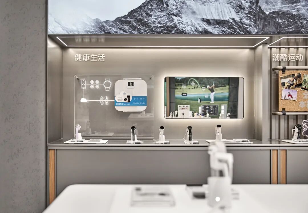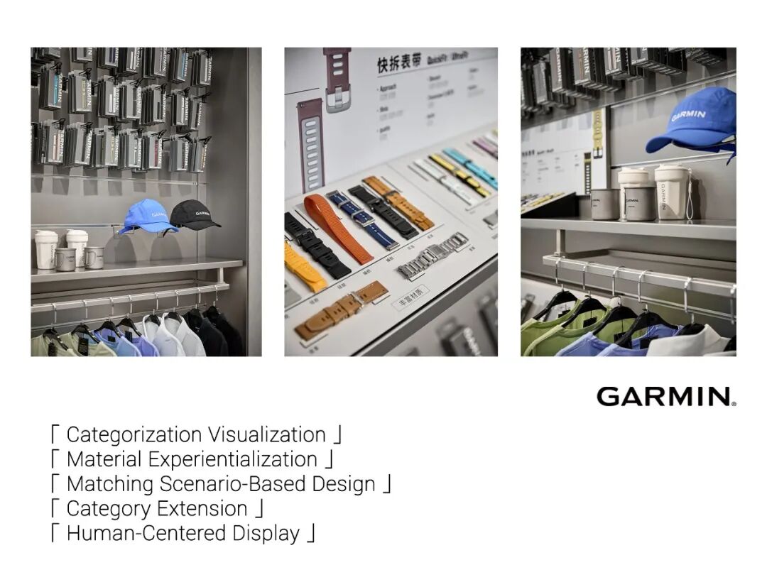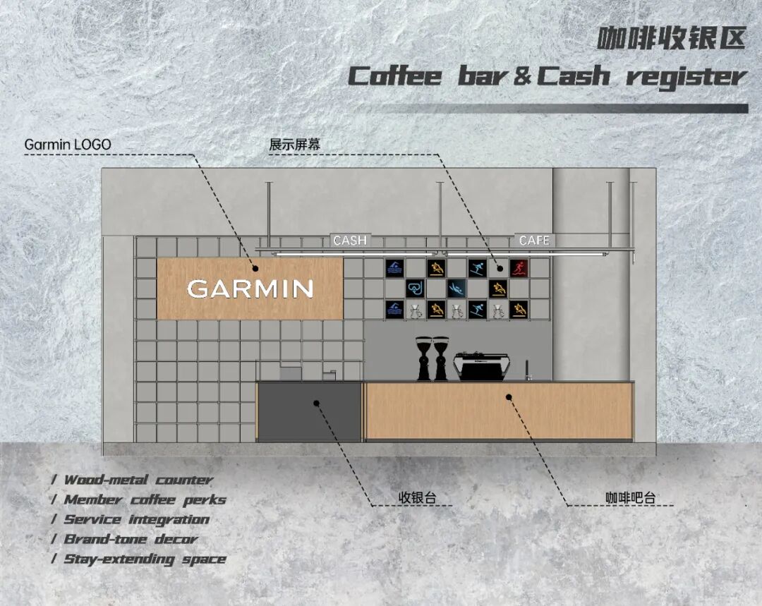 潮酷运动区用软木材质打造照片墙,采用不规则模块化布局,张贴运动者实拍照片,一侧搭配放手表 LED 装置,模拟手表实时数据界面,形成 “科技与人文” 的对话健康生活品类展示区域,以营造 “静谧且具科技感的健康体验空间” 为目标。展示区采用浅色调为主的空间基调,搭配柔和的嵌入式灯光,营造出温馨且专业的氛围。透明亚克力板清晰呈现产品生态链路,直观展现 Garmin 健康系列产品如何通过整合身体数据、运动数据、睡眠数据等,完善健康管理与训练计划;陈列台简洁大气,让用户在舒适的空间氛围中,沉浸式感受 Garmin 健康生态的全面与精准。户外探险区背景墙采用 “抽象化山峰” 设计,选用灰色微水泥材质,通过肌理拼接模拟山峰层叠轮廓,局部嵌入暖光照明勾勒山脊,下方预留展示台陈列设备,形成 “设备与场景” 的视觉关联。配件区以 “清晰化、可视化” 为设计原则,重点呈现配件的陈列、材质展示、搭配推荐及表带特性,让用户一眼可找到心仪配件;同时拓展服饰与周边产品陈列,丰富品牌内容,延伸品牌在日常、运动等多场景的使用场景,提升空间的产品丰富度与用户选择空间。咖啡收银区践行 “功能整合化” 设计,将收银与咖啡服务整合于同一吧台,有效节省空间,同时强化 “休闲服务” 属性;咖啡服务作为会员绑定的重要模块,通过 “消费 - 休闲” 的联动,提升用户停留意愿;吧台与背景墙均采用 “木质饰面结合金属” 材质,呼应品牌 “冷静有温度,科技有关怀” 的调性;外摆休息区与室内连通,为用户提供 “沉浸式休闲” 场景,延长停留时间,深化品牌体验。
