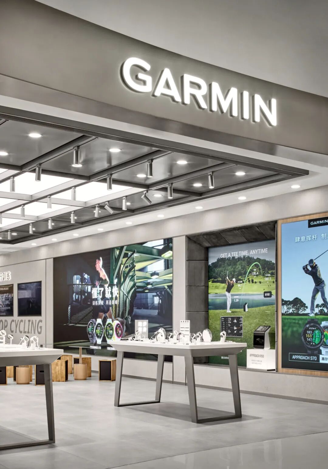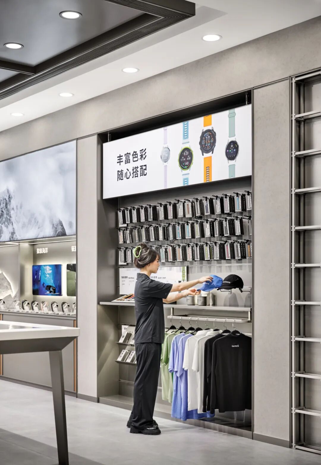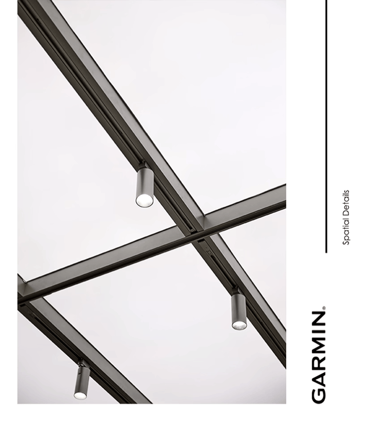 体验台以不锈钢为核心材质打造,其规整的台面布局能实现品牌各类产品的有序陈列,让每一款产品都能清晰展示自身特色与功能。同时,体验台巧妙整合了储物功能,在保障空间具备开放交互性、便于用户近距离接触和感受产品的基础上,完美平衡了展示需求与实用性能,为用户营造出既能沉浸式体验产品,又能便捷获取相关配件等物品的优质空间,助力用户更深度、全面地体验 Garmin 产品。空间的质感与温度,藏于每一处精心打磨的细节之中。Garmin 南京旗舰店从 “用户体验” 出发,在各区域融入精准设计,让科技感与人文感通过细节自然交融。主视觉区域以金属架构建空间骨架;空间照明采用 “吸顶灯 + 射灯” 的多层次设计,吸顶灯提供柔和基础照明,射灯聚焦重点区域,适配不同场景需求。