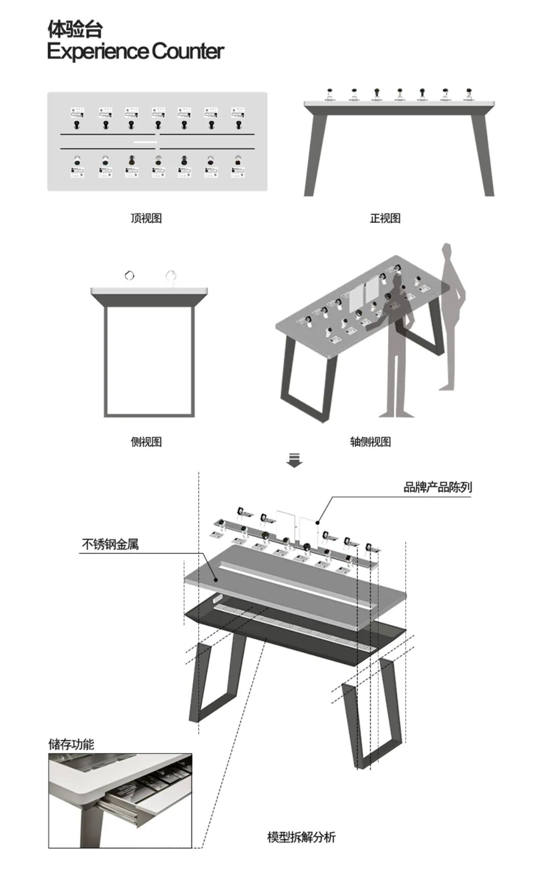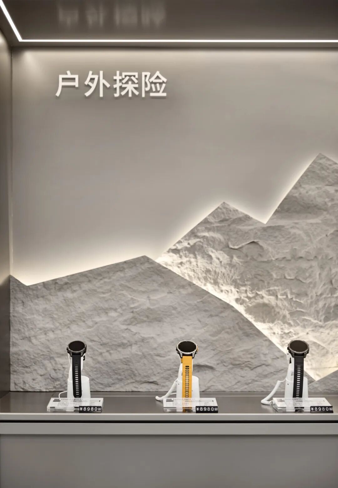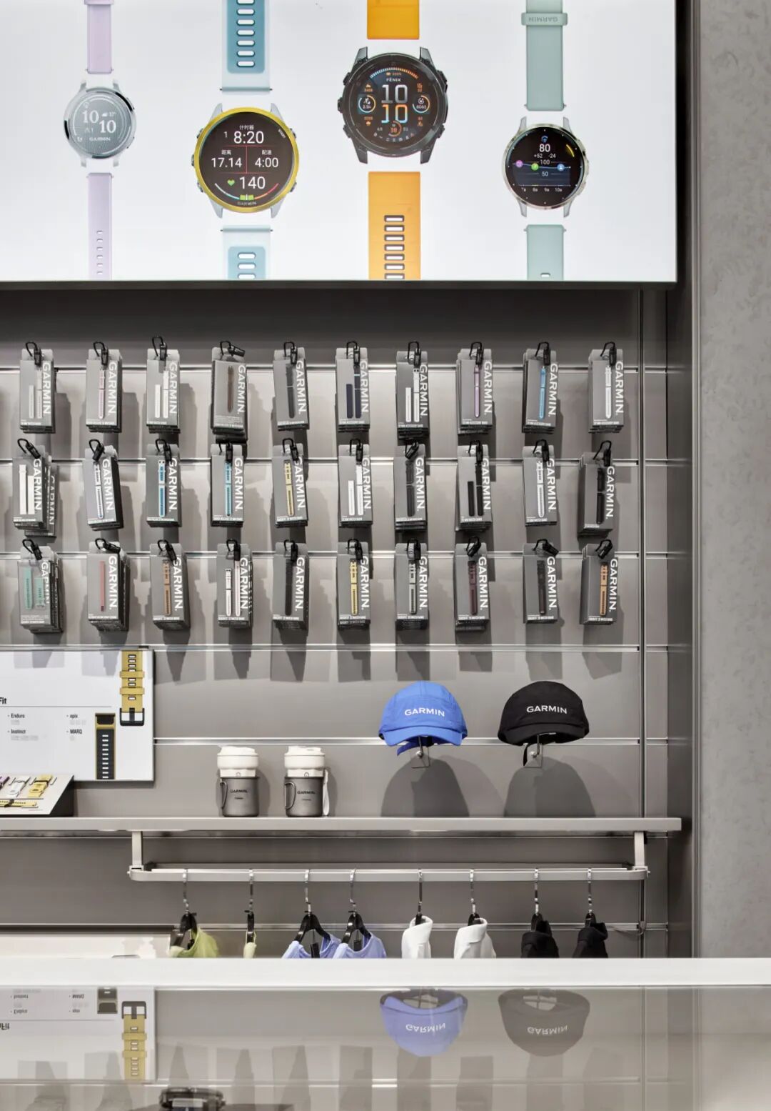 体验台以不锈钢为核心材质打造,其规整的台面布局能实现品牌各类产品的有序陈列,让每一款产品都能清晰展示自身特色与功能。同时,体验台巧妙整合了储物功能,在保障空间具备开放交互性、便于用户近距离接触和感受产品的基础上,完美平衡了展示需求与实用性能,为用户营造出既能沉浸式体验产品,又能便捷获取相关配件等物品的优质空间,助力用户更深度、全面地体验 Garmin 产品。空间的质感与温度,藏于每一处精心打磨的细节之中。Garmin 南京旗舰店从 “用户体验” 出发,在各区域融入精准设计,让科技感与人文感通过细节自然交融。主视觉区域以金属架构建空间骨架;空间照明采用 “吸顶灯 + 射灯” 的多层次设计,吸顶灯提供柔和基础照明,射灯聚焦重点区域,适配不同场景需求。