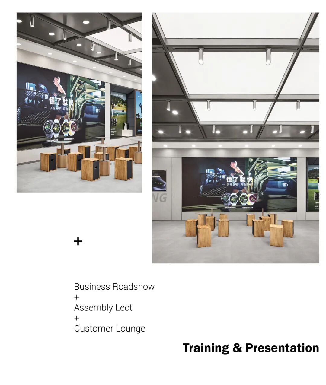 骑行生态区(骑行训练区域)定位 “沉浸式骑行体验空间”,核心配置可移动骑行设备,搭配实时显示运动数据的屏幕,屏幕重点呈现南京本地路线图与景色,让用户在体验中感受 “本土骑行场景” 的真实感,强化归属感与体验感;空间设计围绕 “运动动态” 展开,通过场景化呈现,让用户直观感受 Garmin 设备在骑行中的数据监测与辅助功能。培训宣讲区定位 “多功能复合空间”,核心配置大块高清屏幕与组合式桌椅,可灵活切换 “商业路演”“集会宣讲”“顾客休息” 等模式。△ Training & Presentation Area举办路演时,桌椅可按需调整布局,突出屏幕展示功能;日常时段,桌椅供顾客休息,同时可作为运动知识分享、产品使用教学的场地,适配多元场景需求,强化空间的实用性与灵活性。