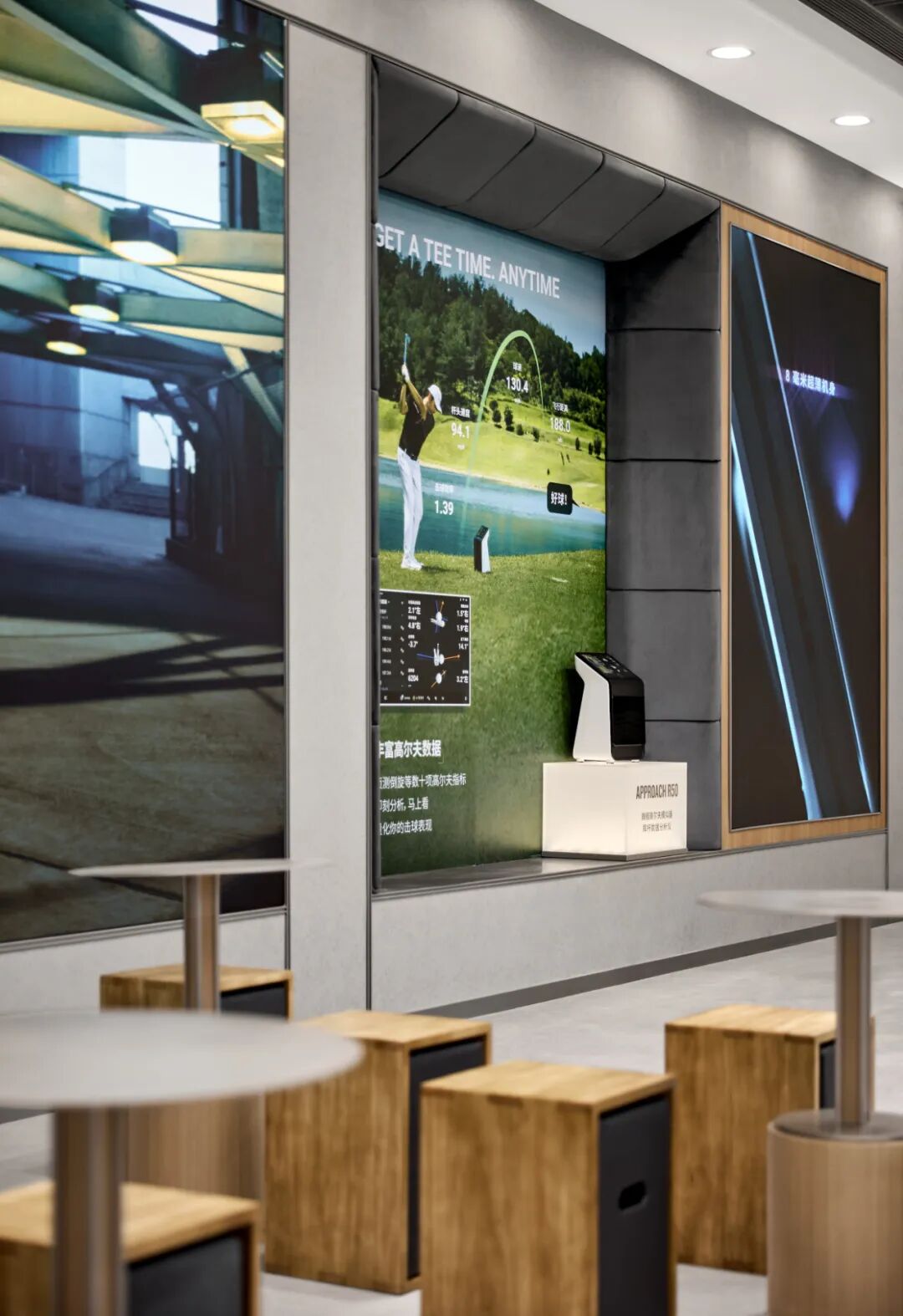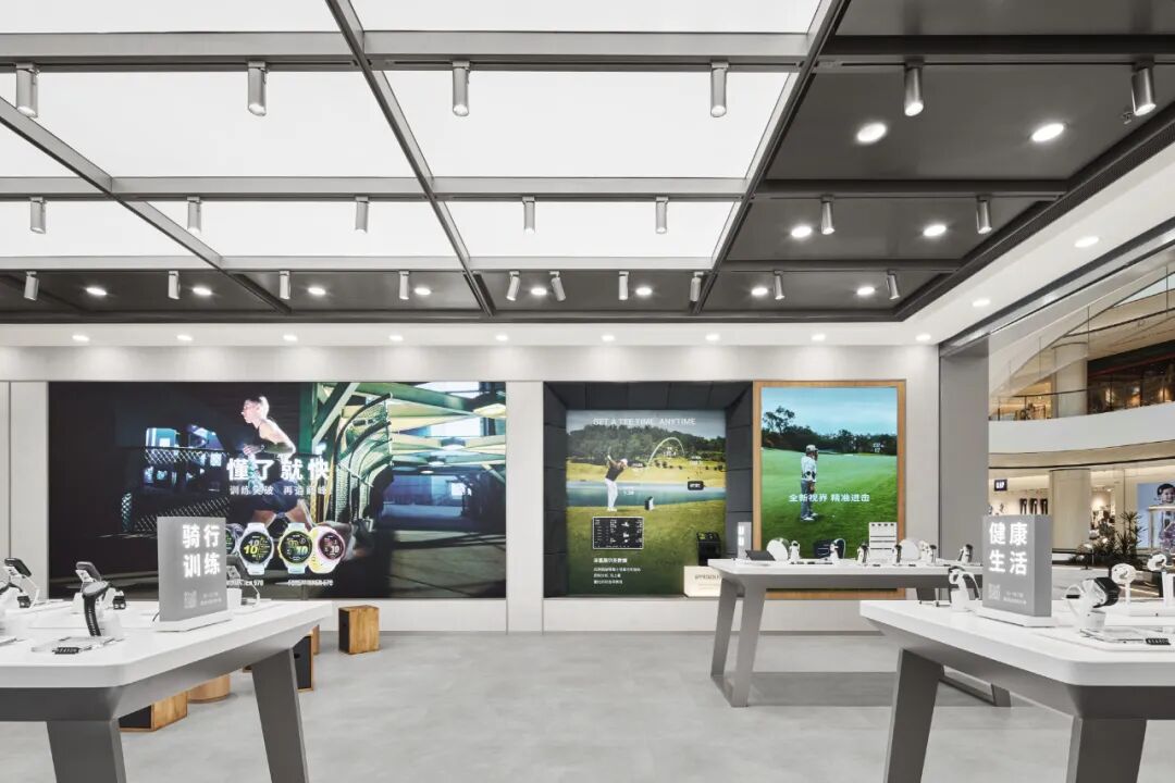 高尔夫击球展示区聚焦 “互动式专业体验”,通过模拟高尔夫运动轨迹的设备,结合 Garmin 自主设备,直观展现设备在高尔夫运动中的辅助功能与专业表现。空间设计以 “突出产品性能” 为核心,通过场景化模拟,让用户亲身感受设备对运动精度的提升,降低对专业功能的认知门槛。全生态展示区突破传统 “柜体式陈列” 的局限,以 “打破墙面柜体界限” 为设计核心,采用开放式陈列方式展示 Garmin 全生态产品,涵盖探索海洋、征服果岭、户外探险、潮流运动、健康生活等系列;搭配品牌 “以专业,至无境” 的 Slogan,让用户直观看到品牌产品矩阵的完整性;陈列设计注重 “场景 - 产品” 关联,提升产品与用户需求的匹配度,更具针对性地服务不同受众。