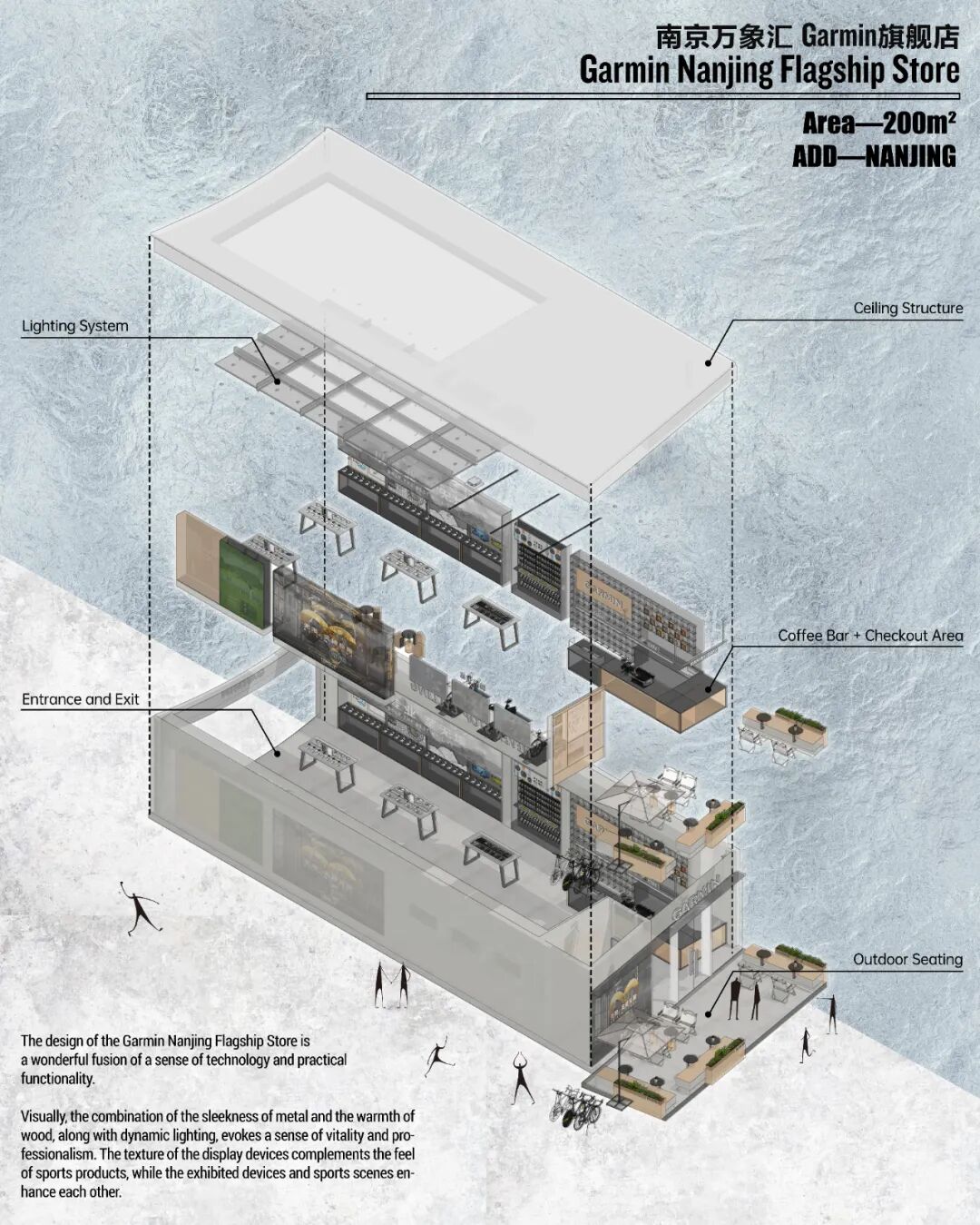 以设计为纽带,联结运动科技的精准与空间体验的温度,是 Garmin 南京旗舰店的核心设计逻辑。本案通过品牌精神的空间转译、在地文化的场景融入,将商业空间转化为 “运动体验场” 与 “品牌对话载体”,既承载 Garmin 三十余年的专业基因,也探索科技类商业空间的人文表达路径。