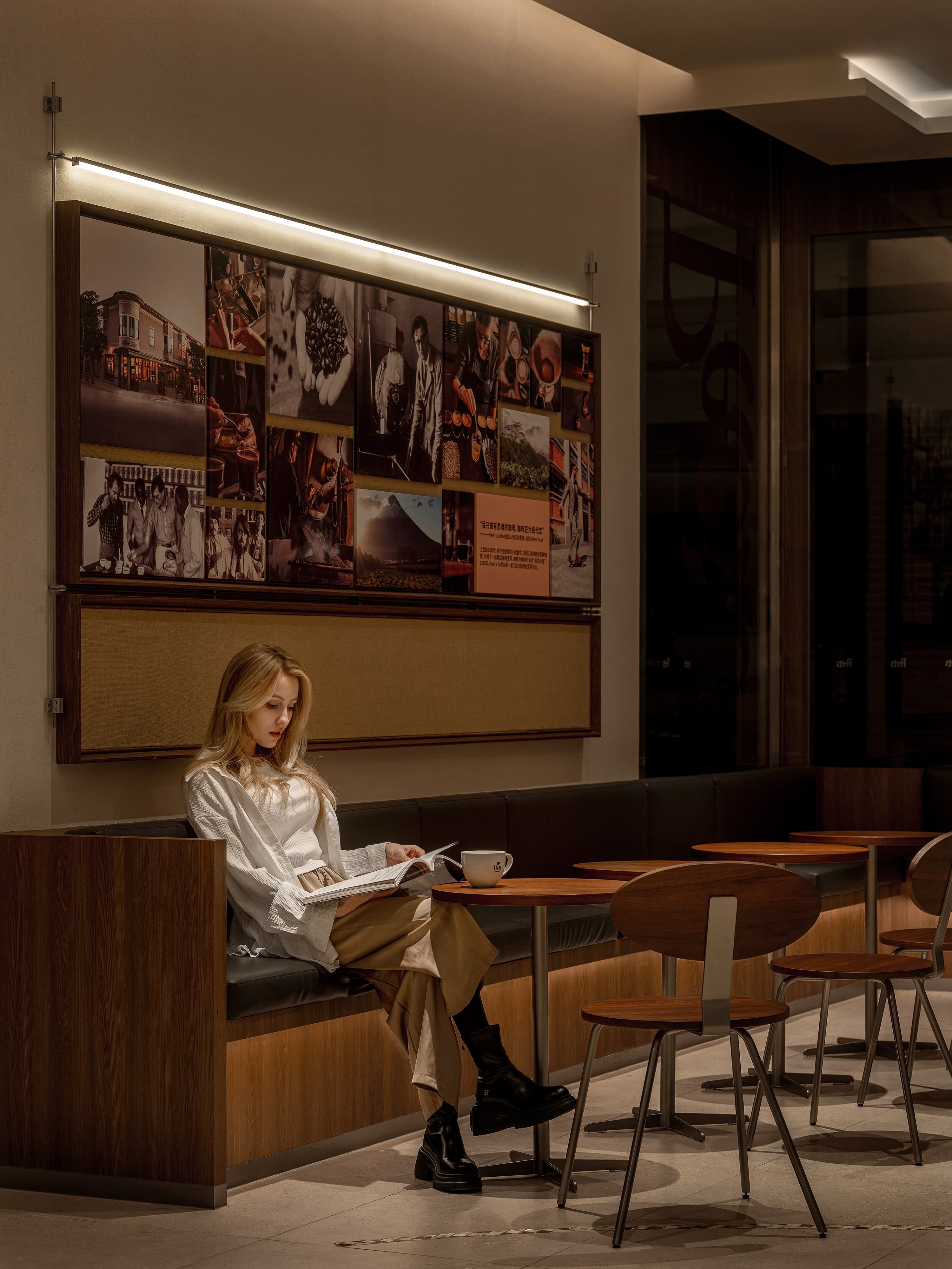 As sunset streams through porthole-like glass partitions, casting fluid light patterns on floors, one suddenly grasps "space as brand": Here lies not just coffee but a city’s modern microcosm.